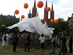 01.10.2006: Mit einem abschließenden Fest beenden die "alten" Kürbispaten ein erfolgreiches Jahr, in dem sie das Kürbiskunstwerk von Vollrad Kutscher betreut haben. Sie übergaben die Verantwortug für das Kunstwerk und die Aufzucht der neuen Kürbisse den neuen Paten des Kunstleistungskurses von Herrn Schneider.