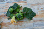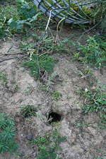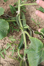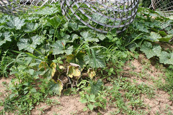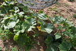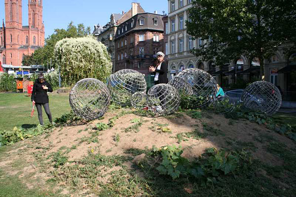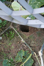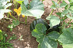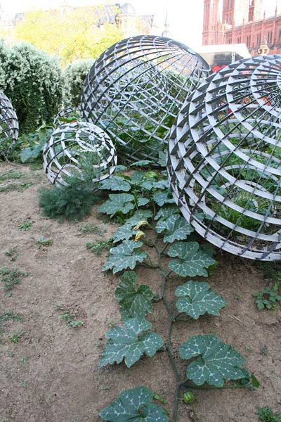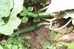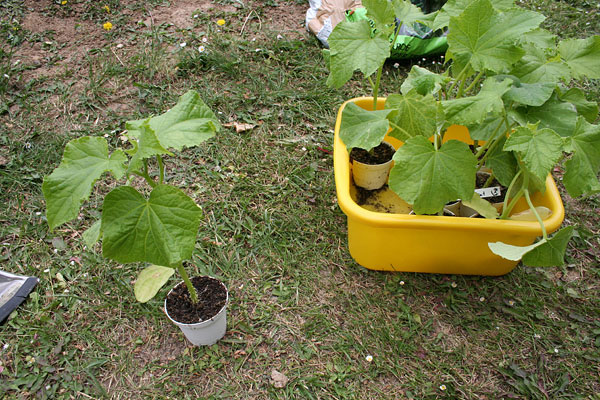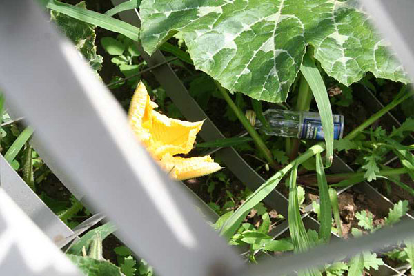 Nachdem ersteinmal kein einziger Zuchtversuch aus Kernen neue Pflanzen zu ziehen erfolgreich war wurden kuzerhand und angesichts des späten Zeitzpunktes kurzerhand 15 Setzlinge eingesetzt. Doch, oh Wunder, die entpuppten sich zum größten Teil als Gurkensetzlinge. Inzwischen wuchsen also ordentliche Gurken auf dem Hügel, inmitten von viel Unkraut. Ein etwas rabiater Einsatz des Gartenamtes zur Säuberung des Hügels von diesem Unkraut führte allerdings zum einseitigen Kahlschlag, auch die Kürbisse und Gurken fielen dem Treiben zum Opfer, bis Frau Engel vom Kulturamt erschrocken dem Einhalt gebot. Ein aufmerksamer Herr aus der Nachbarschaft kaufte kurze Zeit aus Erbarmen über die einseitige Hügelkahlheit eine Kiste mit Blumen und pflanzte sie auf die kahle Seite. Inzwischen hat der Hügel auch ein Karnickel als Bewohner, davon zeugt das Loch unter den Kürbisranken. Wer weiß was in Zukunft sich noch alles so ansiedeln wird. Das eine scheint mir Fenchel oder Dill zu sein. Auf jeden Fall: Das Kürbisfest findet wie üblich am letzten Samstag im September statt, eventuell sogar auch mit Gurkensuppe...