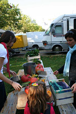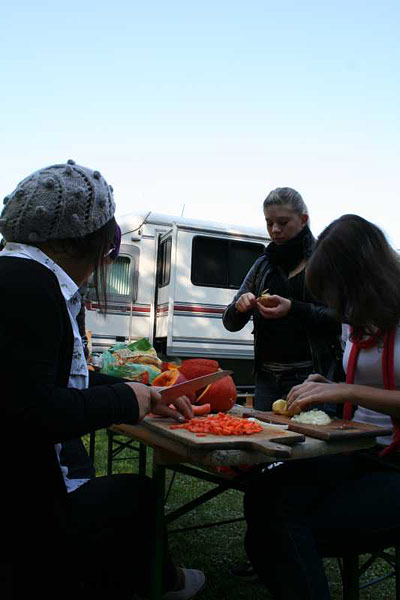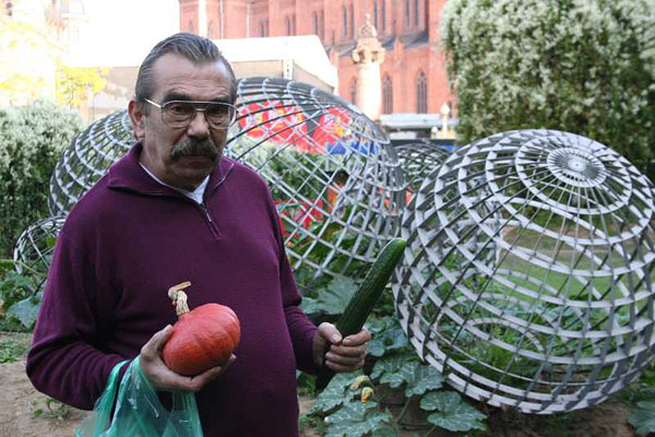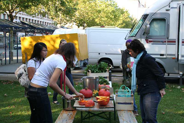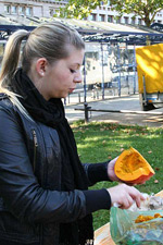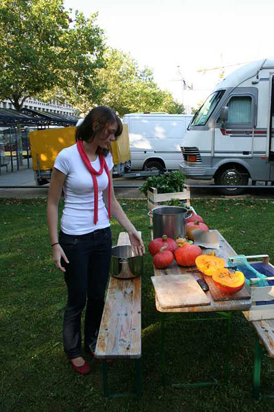 Die Kürbisse vom Hügel dienten diesmal nur als Deko, aber "the show must go on" und daher entstand die Suppe aus gekauften vom Markt. Wunderbares Wetter entschädigte hingegen und die bewundernswerte, große Teilnahme der Anwohner in den Geschäften drumherum - man sieht hier einen Herren mit Gurken und Kürbisgeschenk - von denen wir volle Unterstützung auch in Zukunft zugesagt bekamen. Daneben hoffen wir, daß vielleicht auch neue Paten gefunden werden können, die weniger in den Abiturstress eingebunden sind und daher jünger, damit wir auch im nächsten Jahr das Entstehen der Setzlinge aus den Kernen der Sorte "Atlantic Giant" erleben können und natürlich vielleicht unabhängig vom Stadtfesttermin unser einzigartiges Kunst-Erntedankfest mit Suppe und allen zusammen.