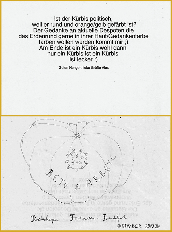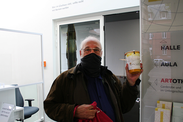 Jedes Glas wird von Vollrad Kutscher in besonderer Weise signiert. Im Rahmen dieses Kunstprojektes wird zudem jedem, der diese Suppengabe erhält, die Gelegenheit gegeben, selbst kreativ zu werden und eine Gegengabe zu gestalten: dieser individuelle Beitrag auf einem DIN A 4 Papier wird dann auf der Homepage des Kürbissuppenfestes zur Erinnerung an dieses besondere Jahr eingestellt.