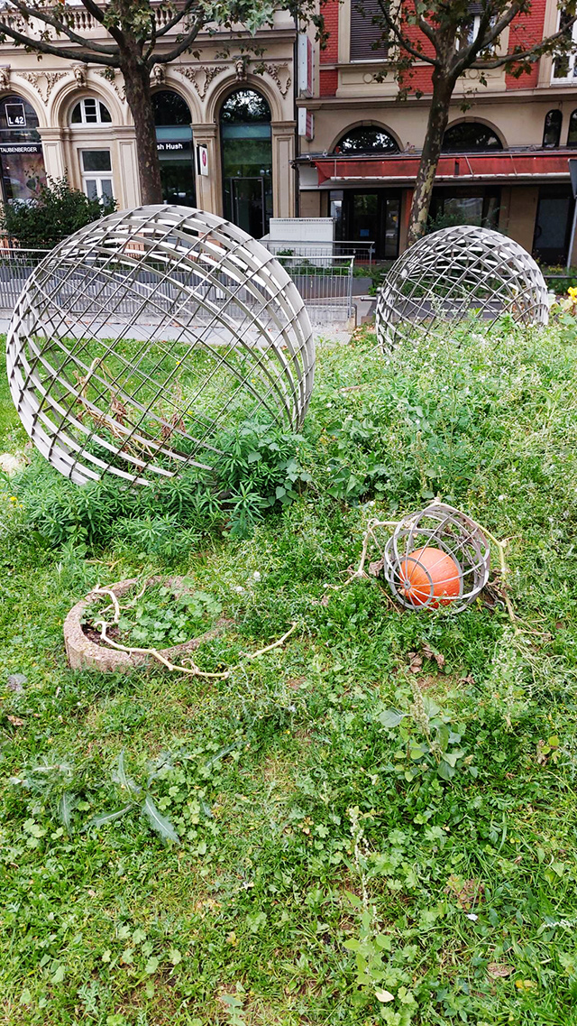 Die Skulptur besteht aus Edelstahlgitterkugeln auf einem Erdhügel. Dieser wird jedes Frühjahr mit Kürbissen bepflanzt, die im Herbst geerntet werden. In diesem Jahr wurde eine vegane Kürbissuppe von EVIM angeboten.