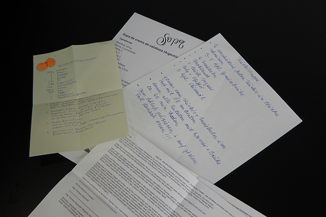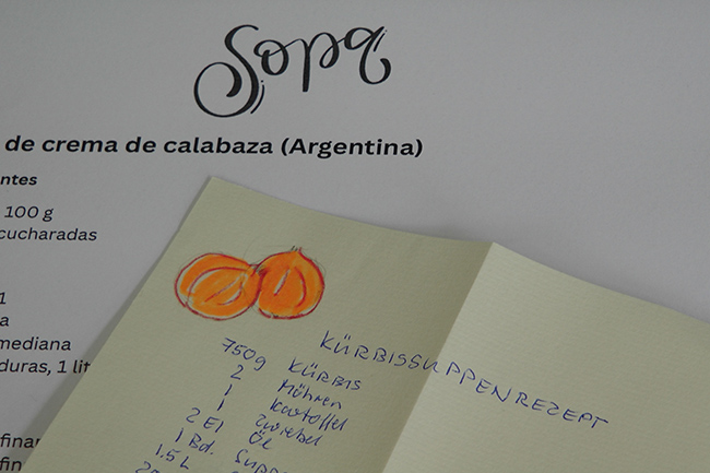 Im Rahmen dieses Kunstprojektes und als kleine Gegengabe sollte von den Empfängerinnen und Empfängern der Suppe ein Kürbissuppenrezept aus unterschiedlichen Regionen der Welt mitgebracht werden. Dies konnte ein Rezept sein, welches man im Urlaub kennengelernt hat oder aus dem Land, aus dem man selbst oder die Familie ursprünglich stammt. Vegetarische oder vegane Rezepte willkommen!